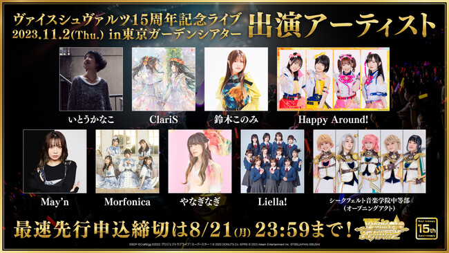 株式会社ブシロード(本社:東京都中野区、代表取締役社長:木谷高明)は、2023年11月2日(木)東京ガーデンシアターにて『ヴァイスシュヴァルツ15周年記念ライブ』を開催いたします。この度、追加出演アーティスト第3弾の情報解禁と最速先行申込期間の延長が決定したことをお知らせいたします。報道関係の皆様におかれましては、ぜひ誌面やWEB媒体で本情報をお取り上げ頂けますようお願い申し上げます。