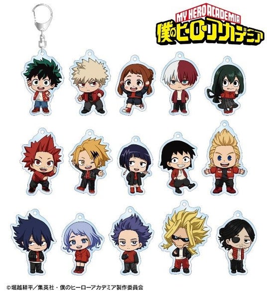 緑谷出久、爆豪勝己、麗日お茶子、轟焦凍、蛙吹梅雨、切島鋭児郎、上鳴電気、耳郎響香、瀬呂範太、通形ミリオ、天喰環、波動ねじれ、心操人使、オールマイト、相澤消太のちびキャラビジュアルをアクリルキーホルダーに仕上げました。