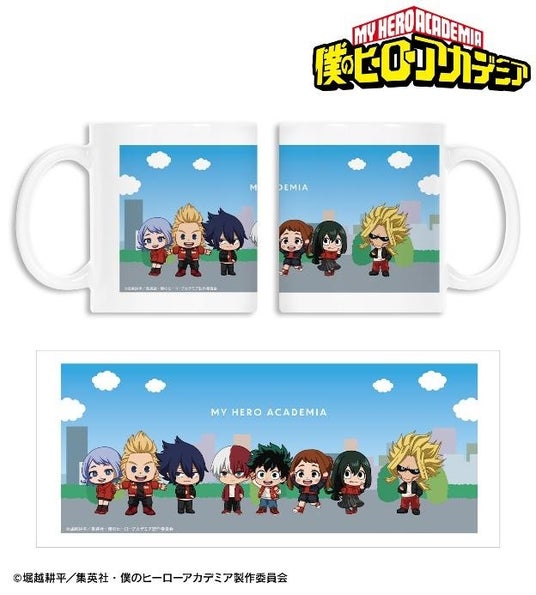 緑谷出久、麗日お茶子、轟焦凍、蛙吹梅雨、通形ミリオ、天喰環、波動ねじれ、オールマイト、爆豪勝己、切島鋭児郎、上鳴電気、耳郎響香、瀬呂範太、心操人使、相澤消太のちびキャラビジュアルをマグカップに仕上げました。