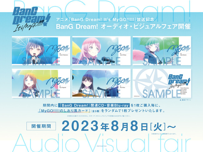 2023年8月8日(火)より、フェア開催対象店舗にて「BanG Dream!」関連CD・音楽Blu-ray(新譜・旧譜含む)を1点ご購入毎に、「MyGO!!!!!のしおり風カード」(全5種)の中からランダムで1枚をプレゼントいたします。