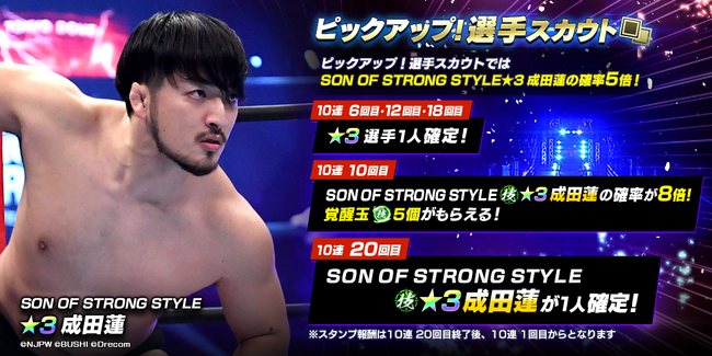 新日SSは2023年8月11日(金・祝)9:00から、★3「[SON OF STRONG STYLE]成田蓮」が登場する「ピックアップ!選手スカウト」を開催しました。本スカウトにて、10連スカウトを既定回数行うと、ラインナップに含まれる★3選手からいずれか1人を確定で獲得できる仕様となります。また、今回初登場する★3「[[SON OF STRONG STYLE]成田蓮」は、ピックアップ対象として、スカウト確率が通常の5倍となっています。