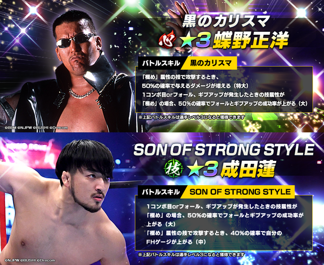 株式会社ブシロード(本社:東京都中野区、代表取締役社長:木谷高明)は、株式会社ドリコム(本社:東京都品川区、代表取締役社長:内藤 裕紀)と共同開発しているスマートフォンゲームアプリ『新日本プロレスSTRONG SPIRITS』(以下、新日SS)にて、2023年8月11日(金・祝)9:00より、三銃士参戦キャンペーンとして、★3「[黒のカリスマ]蝶野正洋」と★3「[SON OF STRONG STYLE]成田蓮」を実装致しました。
