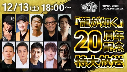 株式会社セガは、これまでの『龍が如く』の歴史をゲストの皆様と語りつくす「『龍が如く』20周年記念特大放送」を、2025年12月13日(土)18:00よりYouTube Live、ニコニコ生放送にて配信することをお知らせします。