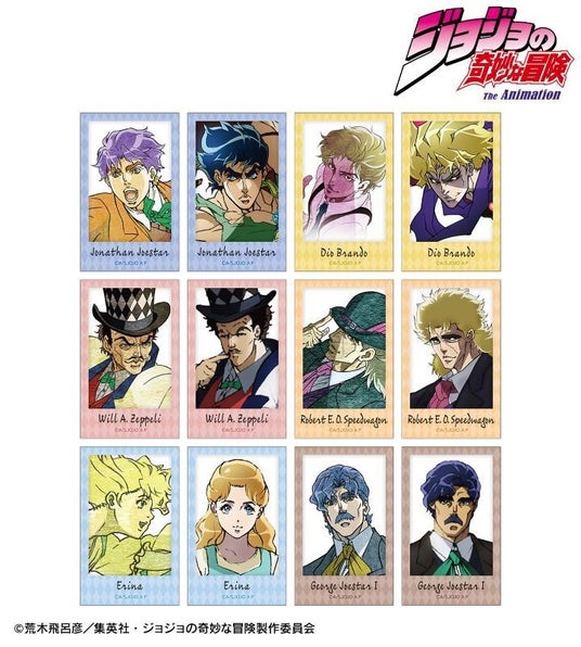 ジョナサン・ジョースター、ディオ・ブランドー、ウィル・A・ツェペリ、ロバート・E・O・スピードワゴン、エリナ・ペンドルトン、ジョージ・ジョースターI世のイラスト、キャラクターの名前、作品名をプラスチックカードに仕上げました。