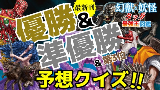 シリーズ累計発行部数550万部目前!「最強王図鑑」シリーズの最新刊『幻獣&妖怪タッグ最強王図鑑』が2024年12月19日(木)に発売されます。新刊発売を記念して、発売前に恒例の予想クイズ大会を開催! トーナメントの優勝者、準優勝者、3位入賞者をすべて当てると豪華な賞品が当たるチャンス!!!
