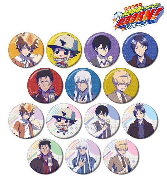 沢田 綱吉、リボーン、雲雀 恭弥、六道 骸、XANXUS、スペルビ・スクアーロ、ベルフェゴールの描き下ろしイラストをグリッター加工を施した缶バッジに仕上げました。