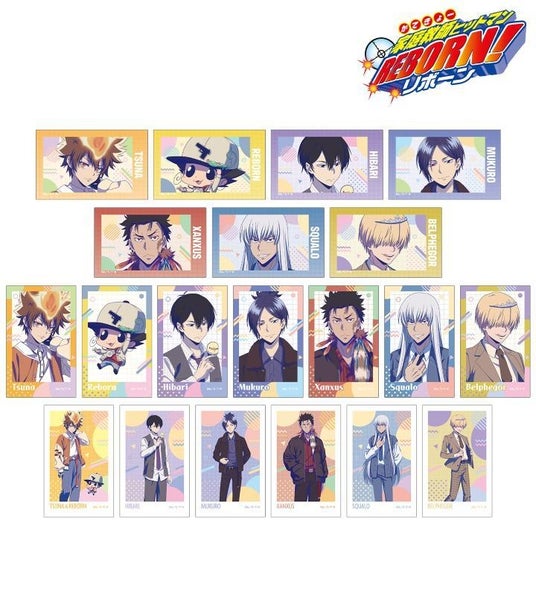 沢田 綱吉、リボーン、雲雀 恭弥、六道 骸、XANXUS、スペルビ・スクアーロ、ベルフェゴールの描き下ろしイラスト、キャラクターの名前をプラスチックカードに仕上げました。