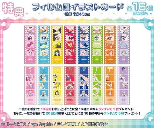 一度のお会計で10回分ご購入ごとに特典フィルム風イラストカード(全16種)の中からランダムで1枚、20回分ご購入ごとにランダムで5枚プレゼント!