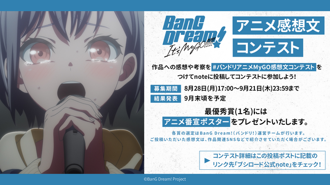 メディアプラットフォーム「note」にて、毎週木曜日にTOKYO MX、ABEMAほかにて放送・配信中のアニメ「BanG Dream! It's MyGO!!!!!」の作品への感想や、考察を募集するコンテストを開催いたします。