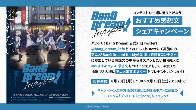 アニメ「BanG Dream! It's MyGO!!!!!」note感想文コンテストで投稿された感想文の中からおすすめの投稿をX(旧Twitter)にハッシュタグ「#おすすめMyGO感想文」をつけてシェアしていただいた方の中から抽選で3名様にアニメ「BanG Dream! It's MyGO!!!!!」番宣ポスターをプレゼントいたします。