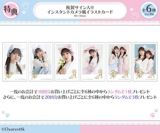 一度のお会計で10回分ご購入ごとに特典複製サイン入りインスタントカメラ風イラストカード(全6種)の中からランダムで1枚、20回分ご購入ごとに3枚プレゼント!