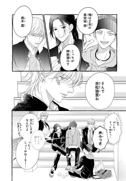 盛り上げ役で陽キャ全開の楽(がく)、長髪&知的なクール男子の湊斗(みなと)、そして寡黙でミステリアスな雷(らい)。
