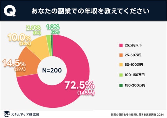 「あなたの副業での年収を教えてください」という質問に対し、72.5%が「25万円以下」、14.5%が「25-50万円」と回答した。このように、副業からの年収は7割が25万円以下、85%以上が50万円以下であることがわかった。