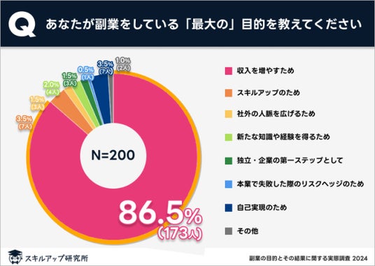 「あなたが副業をしている『最大の』目的を教えてください」という質問に対し、86.5%が「収入を増やすため」と回答した。収入増加が副業の目的として圧倒的に多いことがわかった。