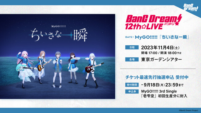 2023年11月4日(土)に、MyGO!!!!!による過去最大規模となる単独公演「BanG Dream! 12th☆LIVE DAY2 : MyGO!!!!!「ちいさな一瞬」が東京ガーデンシアターにて開催予定。現在、チケット最速先行抽選申込を受付中です。