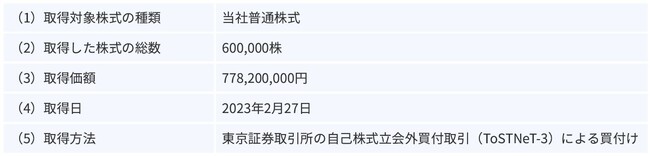 当社は、2023年2月24日にお知らせしました自己株式の取得について、以下のとおり買付けを行いましたので、お知らせいたします。なお、この度の買付けをもって2023年2月24日付の取締役会決議に基づく自己株式の取得は全て終了しました。