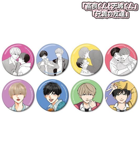 「高良くんと天城くん」4巻の表紙、5巻の表紙、「兄貴の友達」3巻の表紙、「兄貴の友達 僕らのおうち」表紙イラスト、高良瞬、天城太一のイラストを缶バッジに仕上げました。