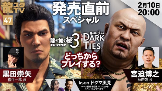 「龍が如くスタジオ」の開発者や関係者が参加し、開発の裏話やフリートークを繰り広げる「龍スタTV」。第47回配信は、2月12日(木)に発売を控える『龍が如く 極3 / 龍が如く3外伝 Dark Ties』を大特集! 桐生一馬役・黒田崇矢さん、神田強役・宮迫博之さんをゲストにお迎えしてお届けします。