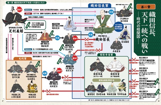 歴史初心者にも分かりやすいように、人物相関図はイラストやフキダシを交えて整理。複雑になりがちな人間関係も、無理なく理解できます。さらに、ポイントとなる織田家や徳川家康との関係性を紹介するコラムも収録し、時代背景への理解を深められる内容になっております。大河ドラマの予習としても楽しめる一冊です。