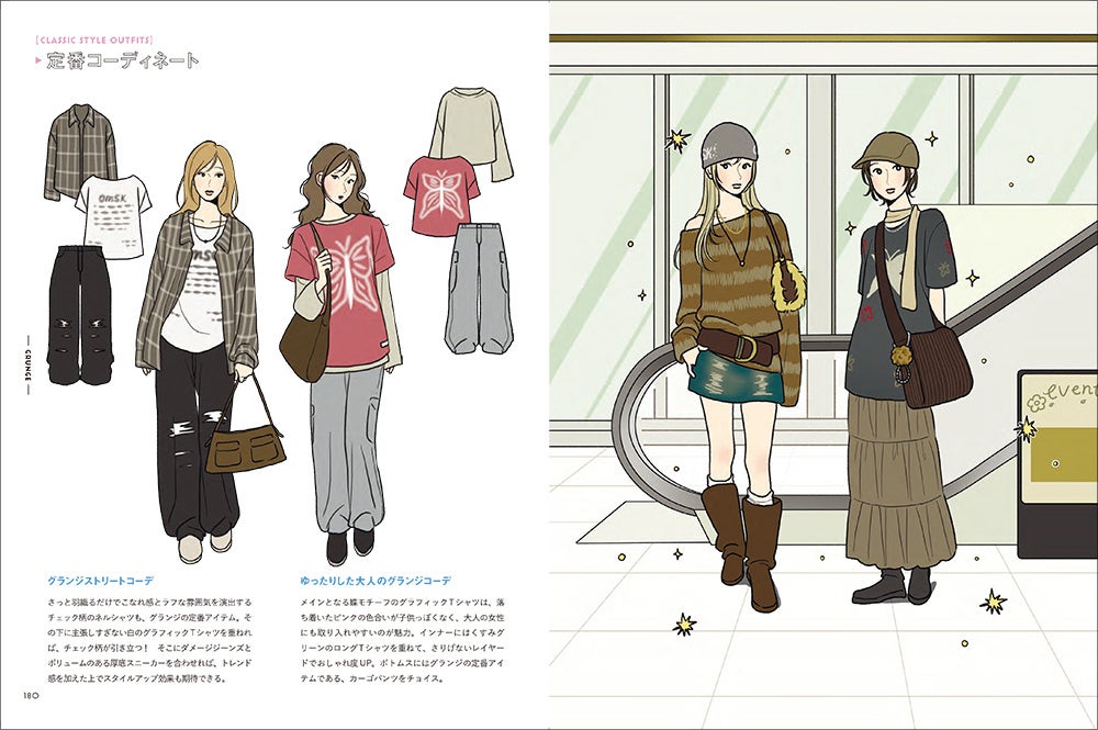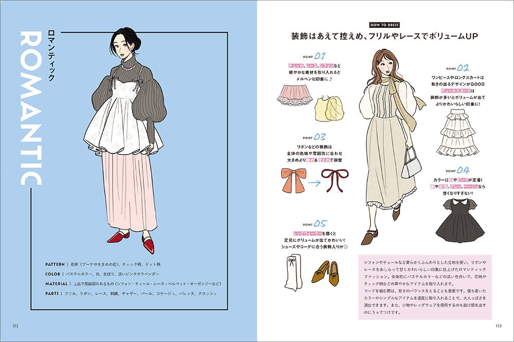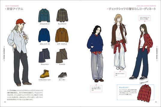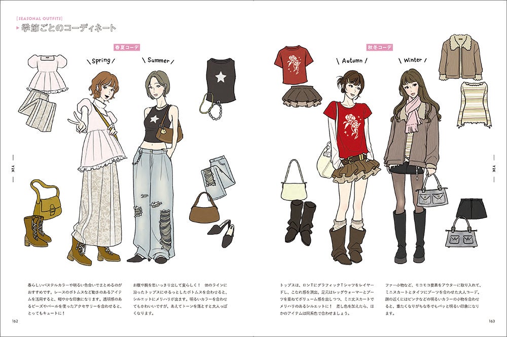 ファッションアイテムの名称や今どきの形状、コーデをつくるコツなども掲載しており、創作の資料にぴったりです。イラストを描く際に「いつも同じような服しか思いつかない」「なぜか野暮ったくなってしまう」といった悩みの解消ができるほか、ファッション雑誌をイメージしたイラスト中心の紙面で、かわいいファッションの女の子がたくさん掲載されたビジュアルブックとしても楽しめます。