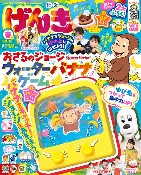 大人気キャラクター「おさるのジョージ」が、楽しいウォーターゲームになって登場! 『げんき 2025年 春号』には、親子で遊べる特別ふろく「おさるのジョージ ウォーターバナナゲーム」がついています。