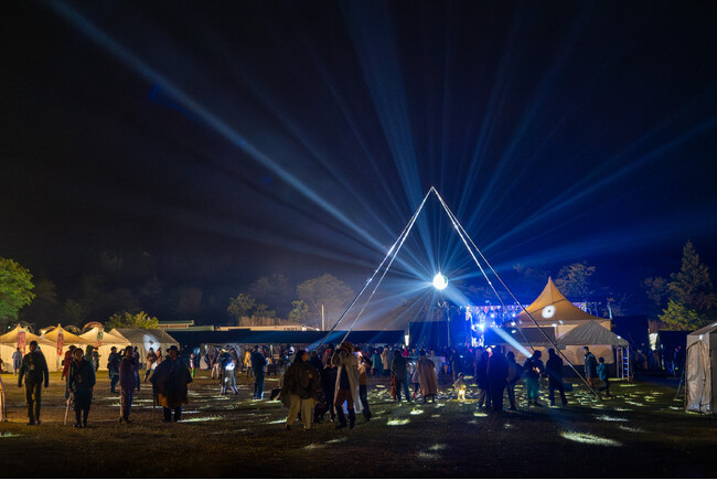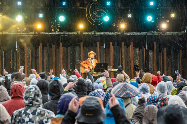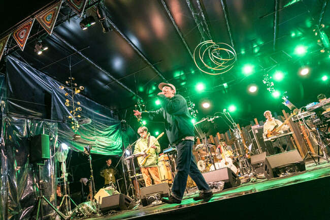 1日目は朝からあいにくの雨が降り続いたが、夜になるにつれ雨もあがり、FUJI&SUNならではの澄んだ空気の中で会場は幻想的なムードに包まれた。出演は、never young beach、折坂悠太(band)、ハナレグミ、EGO-WRAPPIN’(Acoustic Set)、cero、ピーチ岩崎、吉原祇園太鼓セッションズ、TOP DOCA、THE SIDEBURNS with Martin kinoo、優河、君島大空の11組。オープニングセレモニーに続き、トップバッターを飾ったのは、伸びやかな歌声で会場を包み込んだnever young beach。ハナレグミのステージでは、雨雲を吹き飛ばすかのように、「明日天気になれ」を熱唱。声出しが解禁となった今年は、観客が一緒になって合唱するという印象的な場面も。