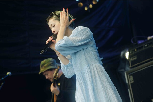 軽やかなブルーの衣装で登場した木村カエラのステージでは、雨の歌詞も印象的な「Sun shower」からスタート。最新アルバムから「ノイズキャンセリング」や、「Butterfly」など新旧の名作を披露した。後半のMC後には、 MOONステージに出演するマヒトゥ・ザ・ピーポーがサプライズでステージに登場する場面も。 「Magic Music」では“ジャンプできるかな?”と観客を気遣いながらも、 “靴を鳴らし 高く高く Jumpして”の歌詞のところでは、ぬかるむ地面にも負けず観客とステージが一体となって飛び跳ねて楽しむ光景が見られた。