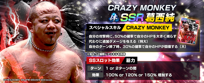 株式会社ブシロード(本社:東京都中野区、代表取締役社長:木谷高明)は、株式会社ドリコム(本社:東京都品川区、代表取締役社長:内藤 裕紀)と共同開発しているスマートフォンゲームアプリ『新日本プロレスSTRONG SPIRITS』(以下、新日SS)にて、2023年10月25日(水)メンテナンス終了後から、「プロレスリングFREEDOMS」より、新規SSRパートナーとして「[CRAZY MONKEY]葛西純」を実装致しました。また、その実装を記念して、全ユーザー様にダイヤ1500個を配布しております。