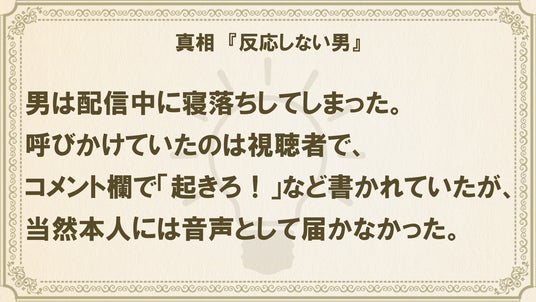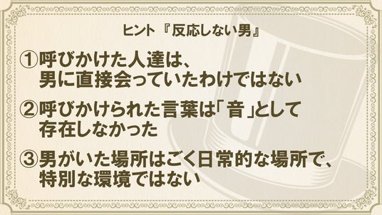 質問と解答を繰り返しながら、真相にたどり着けるのか――?鋭い直感と柔軟な発想力が試される、観客も参加可能な謎解きイベント!