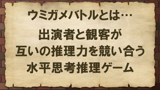 ◆『ウミガメバトル』とは◆人気の推理ゲーム『ウミガメのスープ』をベースにした新コンテンツ。出演者様・観客の皆様は謎の出題者・トルチェ男爵から提示される不可解な問いに挑みます。