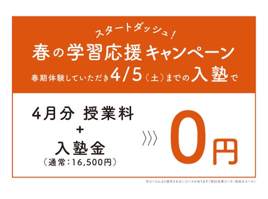 春期講習会をご体験いただき、4月5日(土)までにご入塾いただくと、4月分の授業料が0円になるキャンペーンを開催しております。