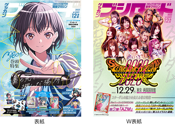 W表紙&巻末特集は、12月29日(金)に「STARDOM DREAM QUEENDOM 2023」を開催する、輝く女子プロレス『スターダム』! その魅力をたっぷりお届けする特集のほか、好評連載中の「輝け!! スターダム女子校」や箕星太朗が新コスチュームを描くイラスト連載など、充実の内容でお届け! さらに4ヶ月連続付録カード第2弾、『Reバース for you』より「AZM」の付録カードもついてきます!