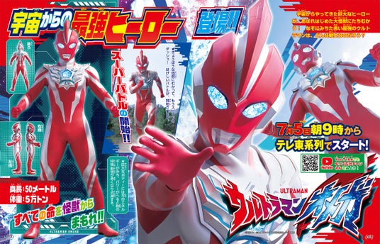 本誌では、新ヒーロー『ウルトラマンオメガ』が初登場! 赤とシルバーのボディに輝く胸のエネルギーコアが特徴で、身長50メートル・体重5万トンの超パワーで怪獣に立ち向かいます。