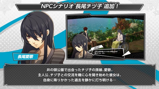 「長尾チヅ子(コードネーム:ヴィノ)」のNPCシナリオが追加されました。シナリオ3話目以降は、メインストーリーの冒頭にも登場した彼女の孫娘・長尾愛歌にフォーカスされた物語が展開します。プレイすると今後の『P5X』の物語がより楽しめるかも…?ぜひご体験ください!