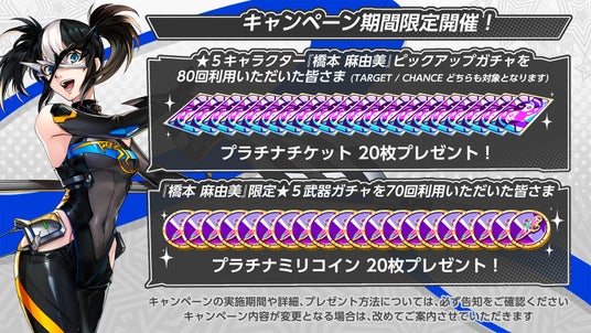 また、「橋本 麻由美」専用武器がピックアップされている武器補給“無音の硝煙”に70回チャレンジすると、契約特典として「プラチナミリコイン」×20が1回のみ獲得可能です。