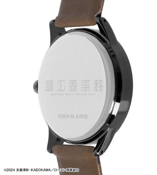 中央には、物語の中でも印象的なホロ、りんご、小麦を組み合わせたモチーフを配置し、時刻の目盛りには、エンディングに登場するイラストを描き起こし、立体パーツで表現しております。