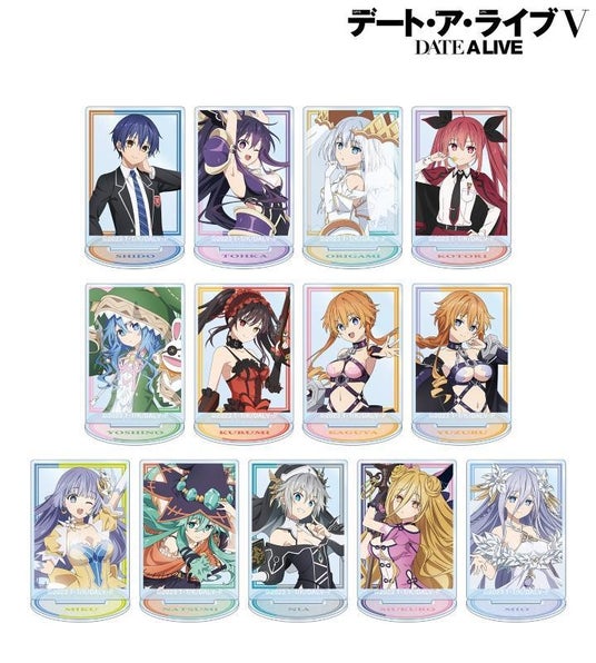 五河士道、夜刀神十香、鳶一折紙、五河琴里、四糸乃、時崎狂三、八舞耶倶矢、八舞夕弦、誘宵美九、七罪、本条二亜、星宮六喰、崇宮澪のイラストをアクリルスタンドに仕上げました。