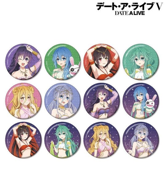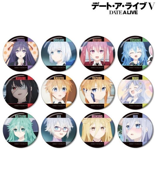 夜刀神十香、鳶一折紙、五河琴里、四糸乃、時崎狂三、八舞耶倶矢、八舞夕弦、誘宵美九、七罪、本条二亜、星宮六喰、崇宮澪の印象的なシーン、キャラクターの名前を缶バッジに仕上げました。