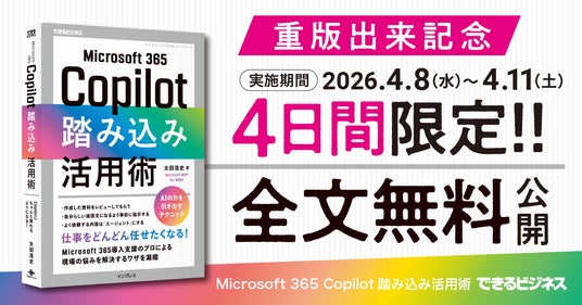 インプレスグループでIT関連メディア事業を展開する株式会社インプレス(本社:東京都千代田区、代表取締役社長:高橋隆志)は、書籍『Microsoft 365 Copilot踏み込み活用術(できるビジネス)』の重版出来を記念して、2026年4月8日(水)~4月11日(土)の4日間限定で全文無料公開キャンペーンを実施いたします。