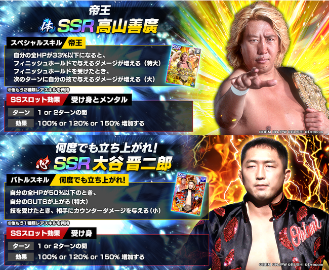 株式会社ブシロード(本社:東京都中野区、代表取締役社長:木谷高明)は、株式会社ドリコム(本社:東京都品川区、代表取締役社長:内藤裕紀)と共同開発しているスマートフォンゲームアプリ『新日本プロレスSTRONG SPIRITS』(以下、新日SS)にて、2023年12月6日(水)メンテナンス終了後より、高山善廣選手と大谷晋二郎選手を応援するため有償限定でのチャリティースカウトを開催いたしました。期間中、各有償限定のスカウトにて、SSR「[帝王]高山善廣」とSSR「[何度でも立ち上がれ!]大谷晋二郎」が登場しています。また各スカウトの売上は、諸経費を除いた金額を支援金として充てさせていただきます。