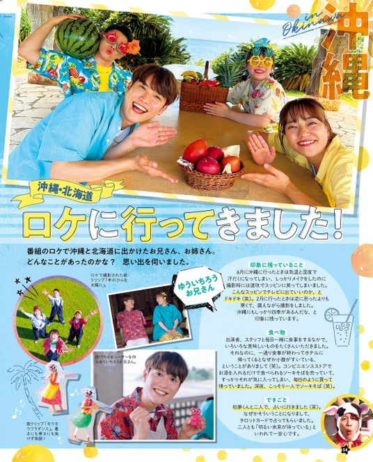 スタッフ大興奮のゆういちろうお兄さん&まやお姉さんたちの撮りおろしや、普段何してるの?が知れちゃうインタビューも盛りだくさん。ロケで北海道と沖縄に行ったときの話も聞いちゃいました。