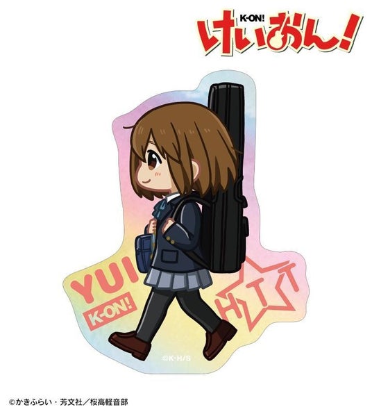 平沢 唯、秋山 澪、田井中 律、琴吹 紬、中野 梓が歩いているちびキャラを新たに描き起こし、オーロラステッカーに仕上げました。
