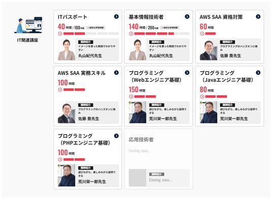 本サービスは、エンジニアの新人教育や即戦力化、従業員のDX教育等を目的としたオンライン動画教材を提供しています。ITパスポートや基本情報技術者、AWS Solution Architects AssociateなどのIT資格を活用したカリキュラムを通じて、ITの基礎・応用スキルを身につけるための講座を準備しております。