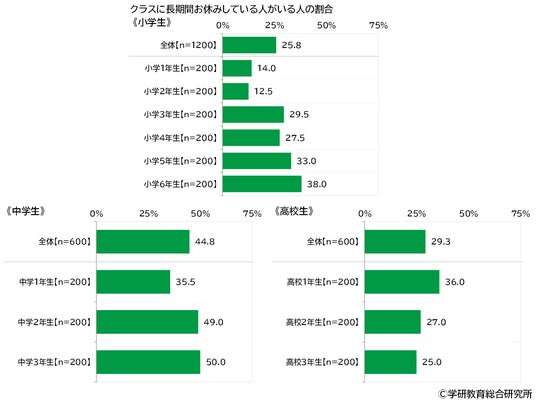クラスに長期間お休みしている人がいるかをきいたところ、「いる」と回答した人の割合は、小学生では25.8%、中学生では44.8%、高校生では29.3%と、中学生が突出して高くなりました。