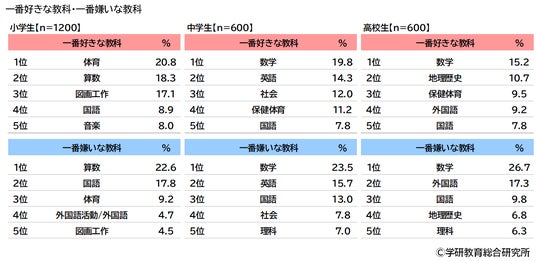 また、中学生と高校生では、一番好きな教科はともに1位「数学」、一番嫌いな教科もともに1位「数学」となり、中学生では一番好きな教科の2位は「英語」、3位は「社会」、一番嫌いな教科の2位は「英語」、3位は「国語」、高校生では一番好きな教科の2位は「地理歴史」、3位は「保健体育」、一番嫌いな教科の2位は「外国語」、3位は「国語」となりました。