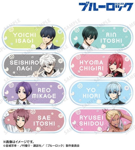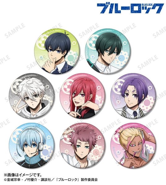 潔 世一、糸師 凛、凪 誠士郎、千切 豹馬 、御影 玲王、氷織 羊、糸師 冴、士道 龍聖の描き下ろしイラストをBIGな缶バッジに仕上げました。