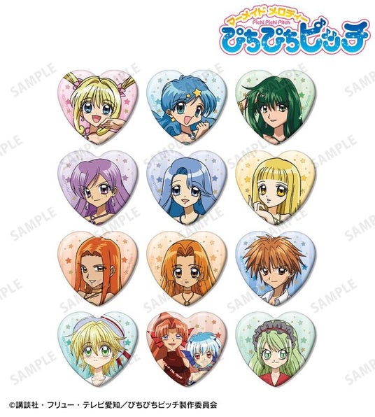 るちあ、波音、リナ、かれん、ノエル、ココ、沙羅、星羅、堂本 海斗、ヒッポ、ブラック・ビューティー・シスターズ、ユーリのイラストをハート型の缶バッジに仕上げました。