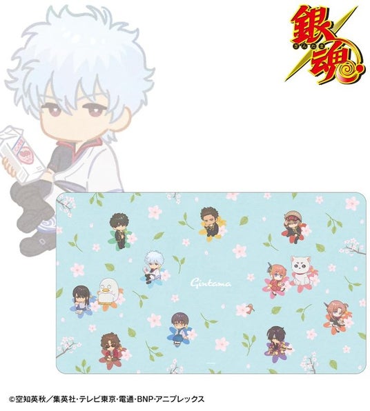 坂田銀時、志村新八、神楽、定春、近藤勲、土方十四郎、沖田総悟、桂小太郎、エリザベス、高杉晋助、神威、坂本辰馬、ジャスタウェイのイラストをボタニカルデザインに落とし込んで繊細なタッチで新たに描き起こし、マルチデスクマットに仕上げました。