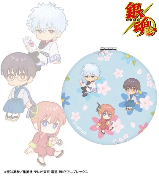 坂田銀時、志村新八、神楽、近藤勲、土方十四郎、沖田総悟、定春、エリザベスのイラストをボタニカルデザインに落とし込んで繊細なタッチで新たに描き起こし、折りたたみミラーに仕上げました。