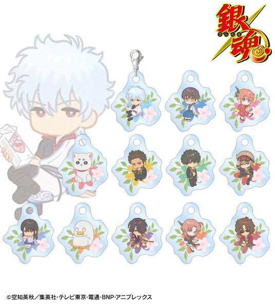 坂田銀時、志村新八、神楽、定春、近藤勲、土方十四郎、沖田総悟、桂小太郎、エリザベス、高杉晋助、神威、坂本辰馬のイラストをボタニカルデザインに落とし込んで繊細なタッチで新たに描き起こし、ダイカットのアクリルチャームに仕上げました。